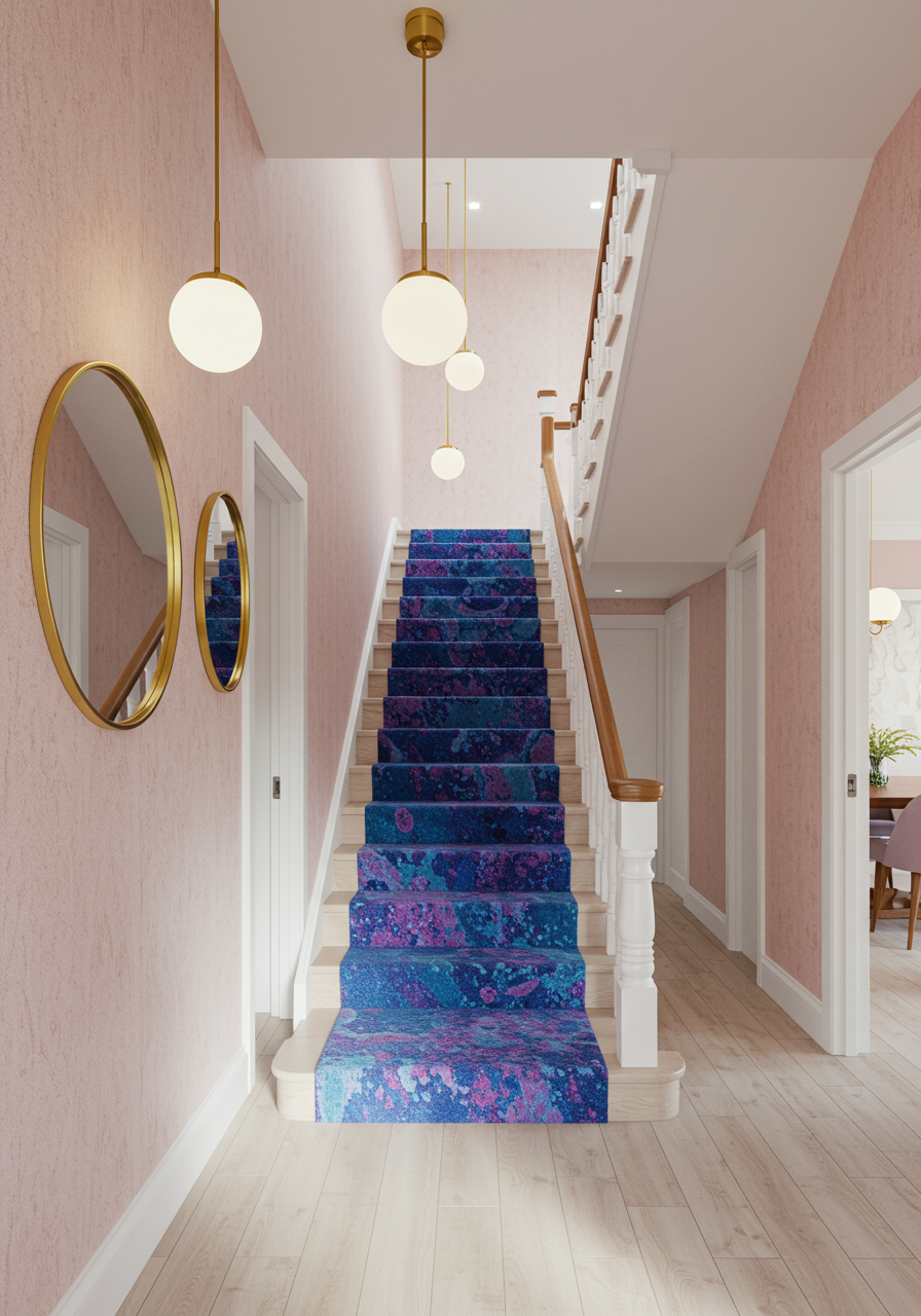 Maybe after nearly 3 years of a pandemic, we are all longing for the embrace of a softer, cozier house. My 12 year old daughter has been a big fan of wall to wall carpeting forever, so I’m giving her full credit for being ahead of the curve on this trend. I have to admit that It’s nice to step out of bed and onto a warm, padded floor, and if you have small children running around, it’s much less scary when they fall on carpeting. They’re calling this: “Cozy Glamour”, and really, expanses of seamless carpeting can make a space feel elegant and layered. It’s also much less loud when one kid shrieks while another is sleeping, because carpeting absorbs sound. For that same reason, it can be a wonderful choice for stairs. It’s nice not hearing your family clunk clunk clunk down echoey hardwood staircases, and you can create a beautiful visual focal point by choosing a colorfully patterned carpet for the stairs.